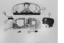 После разборки комбинации приборов ( для этого снять регулировочный резистор для подсветки шкал и систему минипроверки либо систему самопроверки либо бортовой компьютер, после этого вывернуть 11 комбинированных шестигранных/звездчатых винтов либо винтов с крестообразным шлицем снаружи на обратной стороне прибора) становятся доступными следующие элементы.