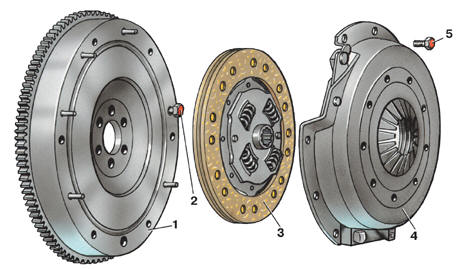 Сцепление (коробка передач типа 084) 1 – маховик; 2 – болт; 3 – ведомый диск; 4 – кожух сцепления с нажимным диском в сборе; 5 – болт