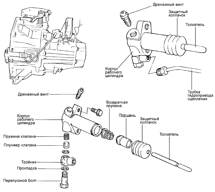 1. Снимите шланг гидропривода сцепления (модификации), перепускной болт, тройник, шайбы, плунжер и пружину клапана, защитный колпачок и толкатель.