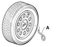 3. Снимите декоративный колпак колеса. Для этого используйте монтировку и проволочную скобу из набора инструментов. Проволочная скоба устанавливается на отверстие колпака или на кромку. Пропустите монтировку через скобу и, потянув монтировку от колеса, снимите колпак.