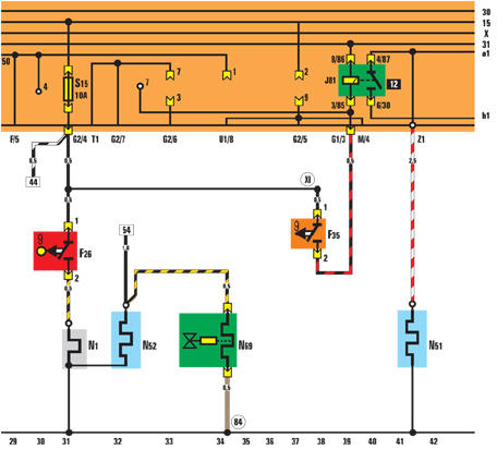 F26 – термовыключатель автоматического пускового устройства карбюратора; F35 – термовыключатель подогрева впускной трубы; J81 – реле подогрева впускной трубы; N1 – автоматическое пусковое устройство карбюратора; N51 – подогреватель впускной трубы; N52 – элемент подогрева карбюратора; N69 – клапан отключения подачи топлива на принудительном холостом ходу