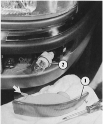 Для отделения корпуса указателя поворотов от корпуса блок-фары (1) у моделей с 4- и 5-цилиндровым двигателем следует сжать крепежные язычки (стрелка) по направлению к патрону и вытащить корпус из направляющих на корпусе фары (позиция 2 показывает нижнюю).